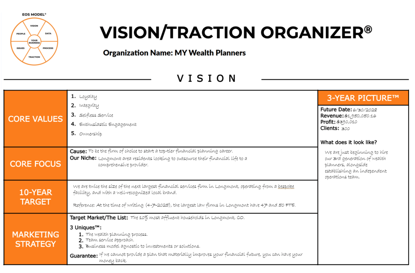 El primero es el V/TO (Vision/Traction Organizer). Es un documento simple, pero poderoso. Te hace responder preguntas clave: